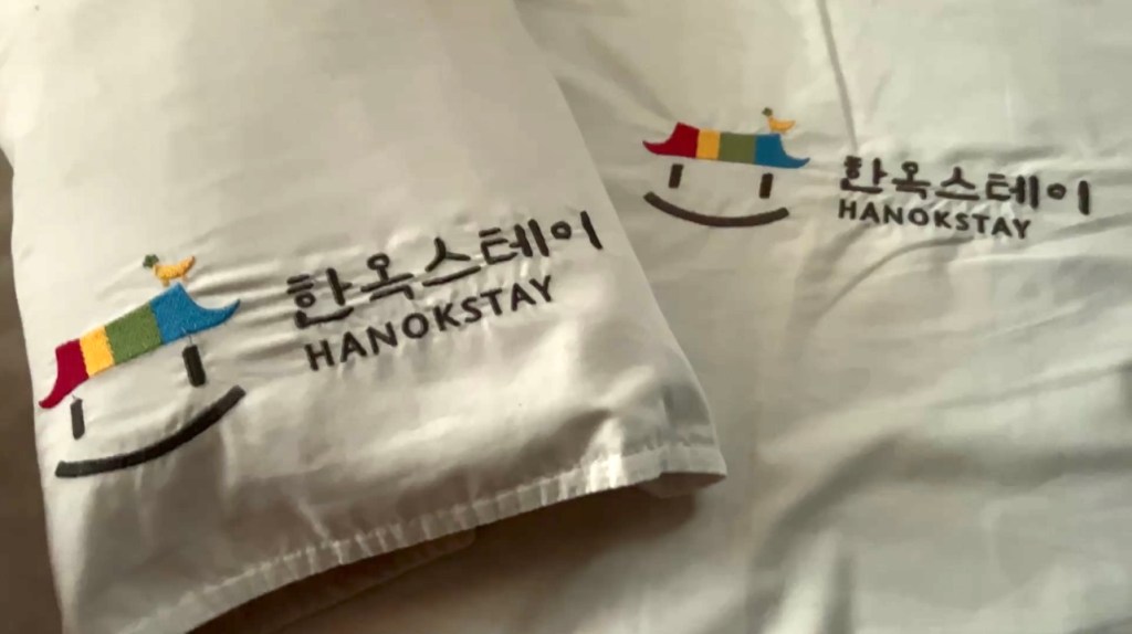 - The room: we stayed at room 103, which has a private modern bathroom, a desk, air conditioning, a beautiful armoire, and heated floors. The beds are traditional floor mattresses that fold in 3. There is a small pillow in a cute embroidered cover, and you are given a colorful traditional duvet to shelter from the cold. Our only complaint is that we couldn’t figure out how to adjust the a/c, so it wasn’t cold enough for us and since the floor heating was on, we were a bit hot throughout the night. It was November, so typically a/c wouldn’t be needed, but we both run pretty hot so we wished we could’ve turned it down just a bit. The windows do have screens, but they’re not perfectly fitted to the frames, so we did get a few mosquito bites throughout the night. The floor mattresses were surprisingly very good for our backs, especially since by this point we had been in South Korea for a full week trekking along, so although unusual, it was a very welcome change. The bathroom was as expected, with the standard shower head over the sink. It was an authentic yet comfortable experience.